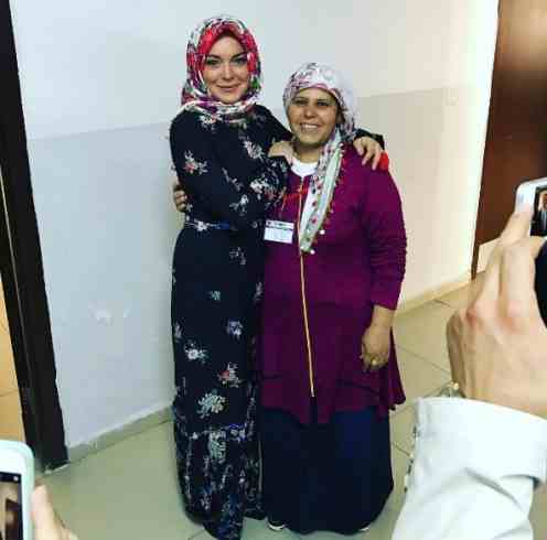وعلّقت لوهان على السورة التي ظهرت فيها بالحجاب قائلةً: “التقيت عاملية مساعدة رائعة اسمها عزيزة في مخيم اللاجئين في غازي عنتاب. رأت أن عيني أضاءت عندما قلت لها أن حجابها هو جميل”.