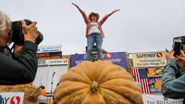 شاهد بالصور .. معلمة أميركية تزرع ثمرة يقطين عملاقة