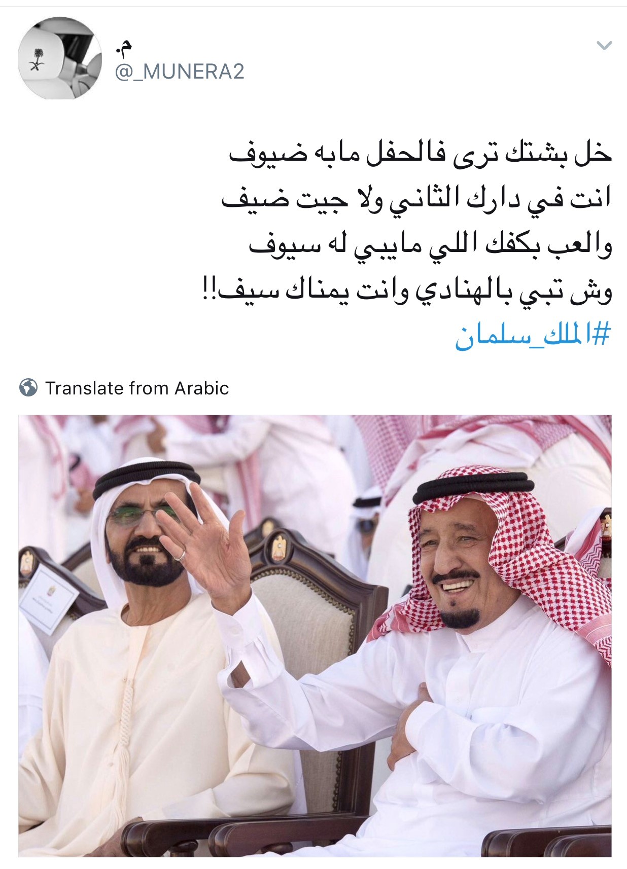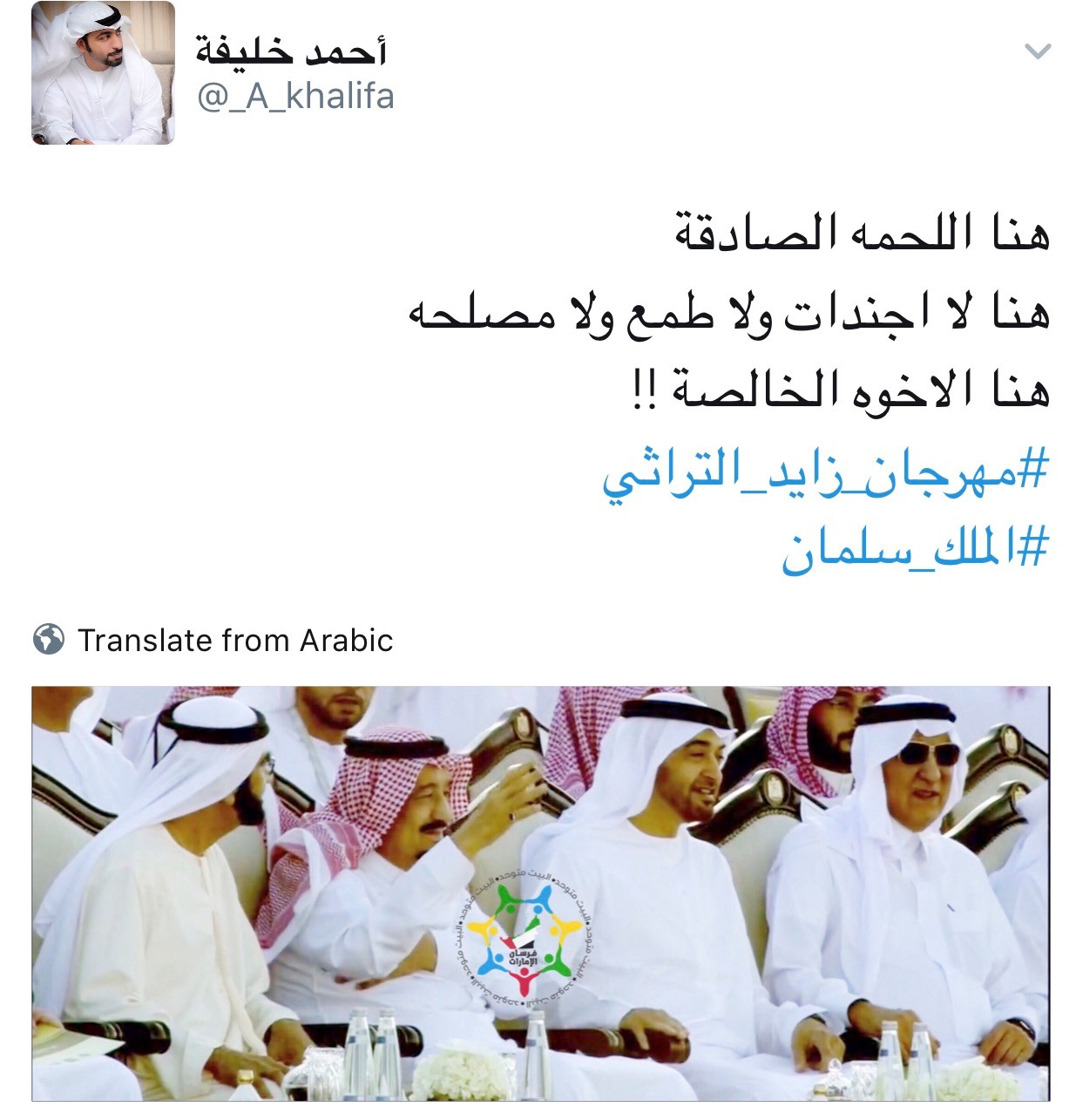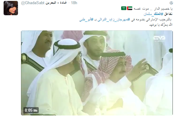 تفاعل مغردون سعوديون وإماراتيون مع فرحة خادم الحرمين الشريفين الملك سلمان بن عبدالعزيز، التي ظهرت في صورة تم تناقلها على شبكات التواصل الاجتماعي، وهو يتفاعل مع الرقصة الشعبية في الاحتفالات المقامة في ميدان الوثبة في مهرجان الشيخ زايد الثقافي.