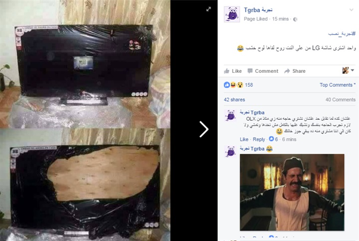 عرضت الصورة شاشة تليفزيون LG أو ما توهم المشترى أنها كذلك حيث اشتراها من أحدهم عبر الإنترنت ليفاجأ في المنزل بأنها مجرد قطعة خشبية مغلفة باللون الأسود وموضوع عليها بعض الملصقات الورقية لتشبه الشاشة الأصلية.