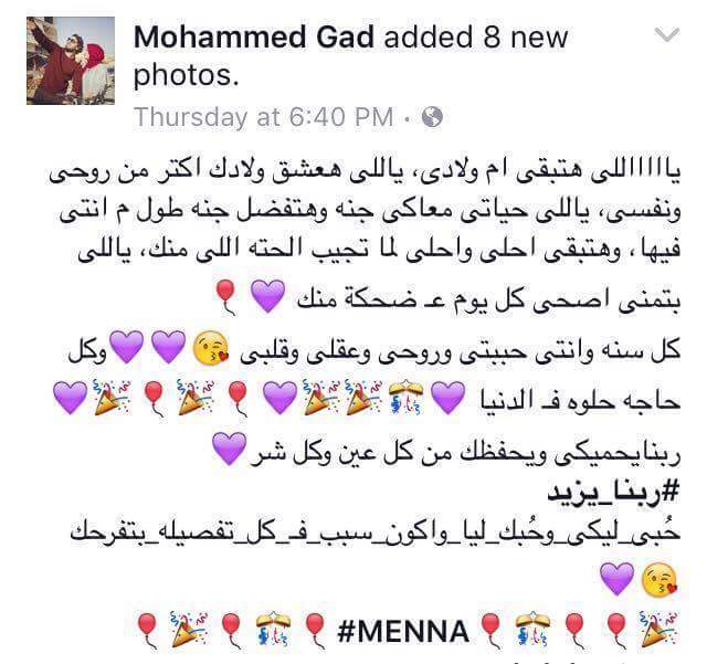 وعلق محمد على إحدى الصور قائلا: “يااااه هتبقي أم ولادي، ياللي هعشق ولادك اكتر من روحي ونفسي، ياللي حياتي معاكي جنة وهتفضل جنة طول ما انتي فيها، وهتبقي أحلى وأحلى لما نجيب حته منك، ياللي بتمني اصحى كل يوم على ضحكة منك”.