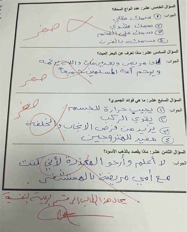 وتظهر الصورة التي تداولها رواد التواصل الاجتماعي، إجابات الطالب الغريبة، التي أجبرت المعلم على إعطائه “صفر”، ومطالبته فى النهاية ” بتحويل الطالب للمصحة النفسية “.