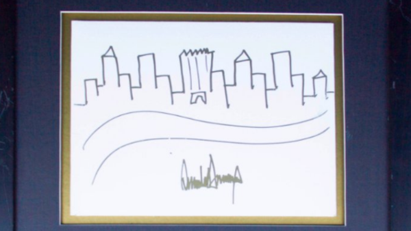 ويظهر رسم ترمب، بمقاس 11.5 بوصة 9X بوصة، سلسلة من ناطحات سحاب مدينة نيويورك، يتوسطها برج ترمب بتصميم مختلف وبشكل واضح يميزه عن المباني الأخرى، موقعاً عليها ترمب بخط يده باستخدام لون ذهبي.