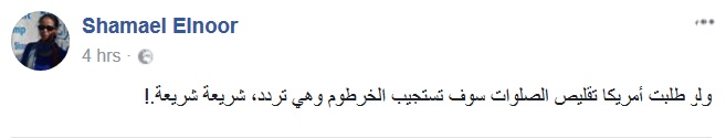 سخرت الصحفية السودانية شمائل النور مساء السبت على حسابها بفيسبوك من الحكومة السودانية وكتبت (ولو طلبت أمريكا تقليص الصلوات سوف تستجيب الخرطوم وهي تردد، شريعة شريعة.!).