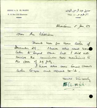 ( لم تكن موجوداً في آخر لقاء لنا في [فندق] سافوي عندما توصلنا إلى تفاهم مع السيد الصديق ولكن رغم أنني أرسلت له تذكيراً في 29 يوليو فإنني لم أتلق رداً. كنت أتساءل ما إذا كان قد فقد عنواني. على أية حال فقد ترك الموضوع معلقاً. أنا الآن أرسل تذكيراً قصيراً للمهدي وسأكون ممتناً لو تحدثت معه لأحصل على رد. دعني أضيف أنه منذ مناقشاتنا فقد قمت بإنجاز تدبير أو إثنين في إطار ما إتفقنا. أنا الآن أريد أن أعرف ما إذا كنت راغباً في تطوير تلك الأنشطةّ ).
