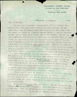 (وعليه فإنني أقترح أن يرسل رجالك في سويسرا شخصاً مناسباً للخرطوم – ويُفضل أن يكون ممَّن يجيدون الإنجليزية أو العربية وأن يحمل جواز سفر بريطاني أو سويسري – لكي يتمكن من دراسة الإمكانيات العملية لفتح المصرف المذكور أعلاه).