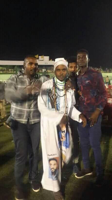 خطف الأضواء خلال حفلات الفنان الشاب “أحمد الصادق” الجماهيرية، معجب يرتدي جلباباً طبعت عليه صورة الفنان الشاب مرفقة بعبارة (درويش الكجونكا) .