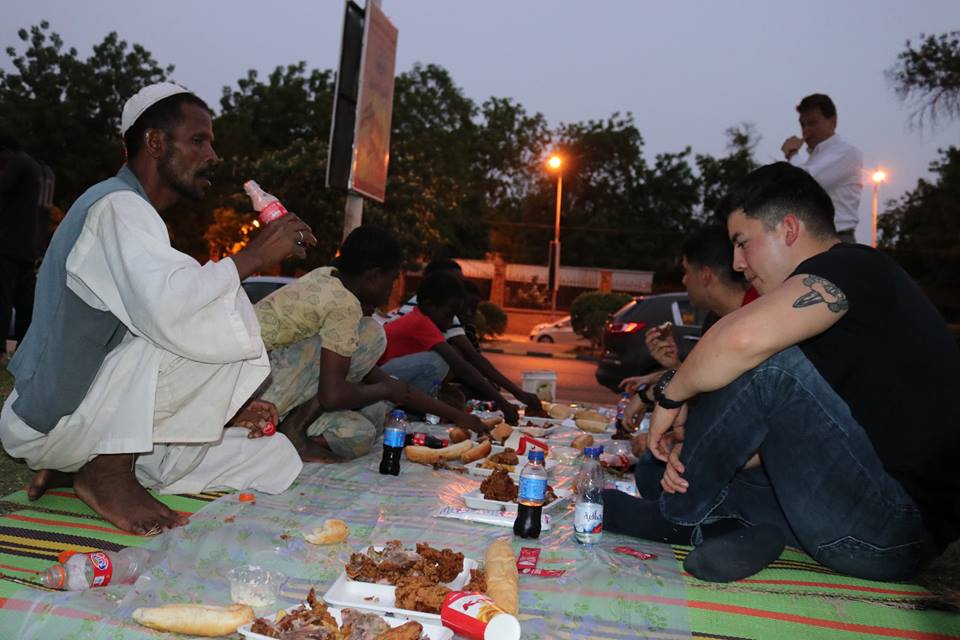 وأضافت صفحة السفارة بحسب ما نقل منها محرر النيلين (تشرف موظفو السفارة الأمريكية ، بمن فيهم أفراد مشاة البحرية الأمريكية-المارينز في 28 مايو بتوزيع المياه للصائمين في شارع النيل ودعوة الغرباء إلى تناول الإفطار على الطريقة الأمريكية من الدجاج المقلي مع شرائح البطاطا المقلية وسلطة الكول سلو).