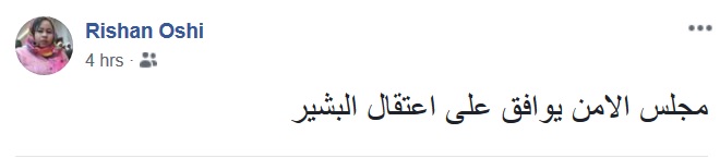 وكتبت رشان بحسب ما نقلت عنها محررة النيلين (مجلس الامن يوافق على اعتقال البشير)، وكتب أحد أصدقائها (هذا الكلام لا اساس له من الصحة، ولم اجد له اي مصدر رسمي في كل القنوات العالمية، والمواقع الالكترونية ذات المصداقية)، حيث تجاهلته رشان ولم ترد عليه.