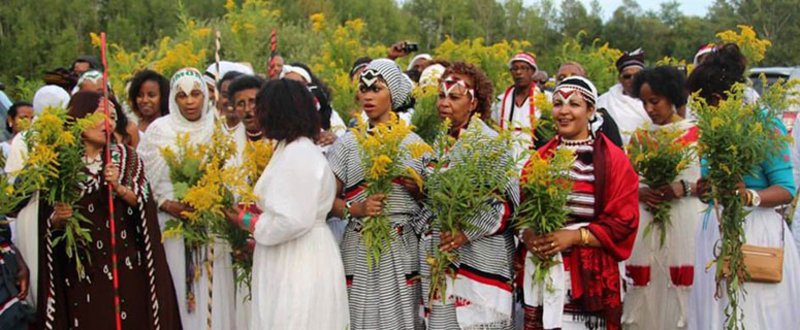وفي العادة يحتفل الإثيوبيون عن طریق فرش الطرقات والمنازل بنوع من الزھور البریة الصفراء، لا تنبت إلا في إثيوبيا وبعضهم يذبح بعض الماشية وتتحول طرقات إثیوبیا خلال الاحتفال إلى ساحات من المهرجانات والفعاليات ویقدم الأطفال خلال الاحتفال باقات الزھور لكبار السن.