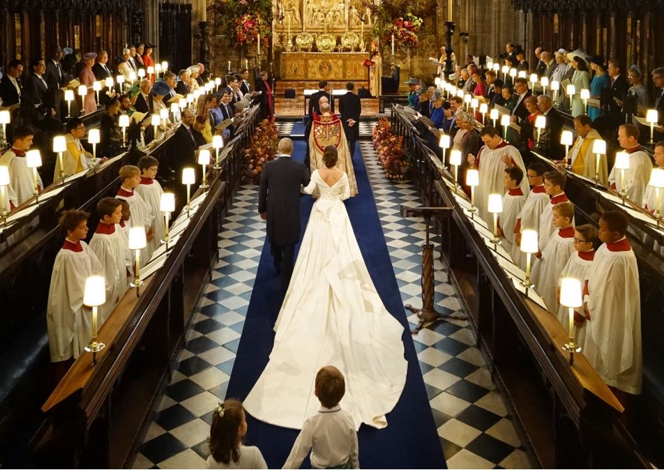 ويوجيني (28 عاما) هي الابنة الصغرى للأمير آندرو، ثالث أبناء الملكة، من زوجته السابقة سارة فيرجسون دوقة يورك. وجرت مراسم زفافها اليوم إلى بروكسبانك (32 عاما) في كنيسة القديس جورج التي تقع داخل قلعة وندسور وتعود للقرن الخامس عشر.