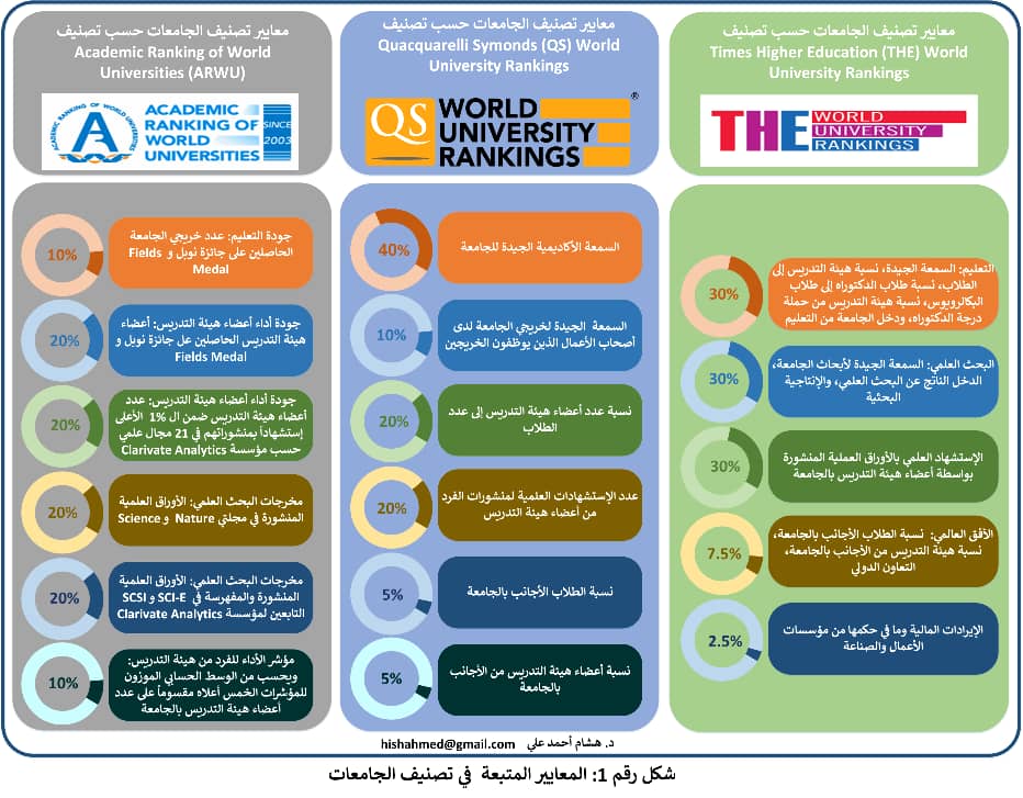 في الشكل رقم (1) المرفق مع هذا المقال قمت بترجمة وتلخيص المعايير التي يتبعها كل تصنيف من التصنيفات الثلاث آنفة الذكر في حساب مؤشرات الأداء حتى يسهل المقارنة بينها. وسنأخذ على سبيل المثال للتوضيح تصنيف THE والذي يجد رواجاً وقبولاً عالمياً وتعتمده معظم الجامعات. فكما موضح بالشكل رقم (1) يعطي تصنيف THE وزناً بنسبة 30% لجودة التعليم، ونسبة 30% للبحث العلمي، ونسبة 30% للإستشهاد بالأوراق العلمية التي تنشر بواسطة أعضاء هيئة التدريس بالجامعة، ونسبة 7.5% للأفق العالمي للجامعة من حيث نسبة الطلاب وأعضاء هيئة التدريس الأجانب بها، ومستوى التعاون العلمي الدولي لها، وأخيراً يعطي تصنيف THE وزن 2.5% لإيرادات الجامعة من الصناعة والأعمال نتيجة ما تقوم به من أبحاث أو تقدمه من نقل معرفة.