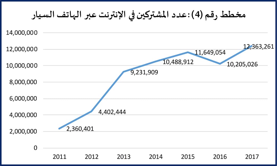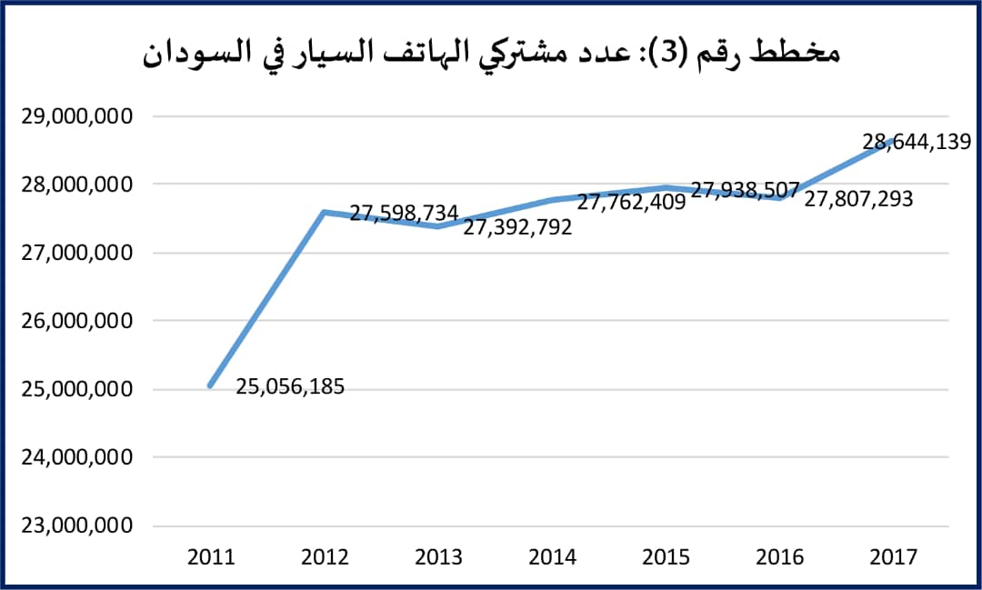 إن المال عبر الموبايل يعتبر وسيلة بسيطة وفعالة وسهلة الإنتشار ويمكن أن تقدم حلاً للمشكلات الراهنة، ويبين المخطط رقم (3) أدناه عدد مشتركي الهاتف السيار في السودان والذي بلغ 28,644,139 مشترك في عام 2017م، بنسبة تغلغل 72%، كذلك المخطط رقم (4) أدناه يبين عدد المشتركين في الإنترنت عبر الهاتف السيار والذي بلغ 12,363,261 مشترك في عام 2017م. وهذه الأرقام تعتبر مشجعة جداً للعمل بفاعلية في نشر خدمات المال عبر الموبايل Mobile Money .