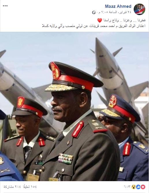 وبعد لحظات اتبعه شقيقه معاذ وكتب تدوينة على حسابه عبر موقع التواصل الاجتماعي فيسبوك قال فيها متغزلاً في والده: (فخرنا … وعزنا .. وتاج راسنا ..اعتذار الوالد الفريق م احمد محمد قرينات عن تولي منصب والي ولاية كسلا).