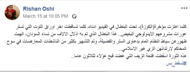 كتبت الصحفية السودانية رشان أوشي على حسابها بموقع فيسبوك (كلما اهتزت مؤخرة(الكوزة)، تحت البنطال في الفيديو ادناه، كلما تساقطت اخر اوراق التوت التي تستر عورات مشروعهم الايدولوجي البغيض).