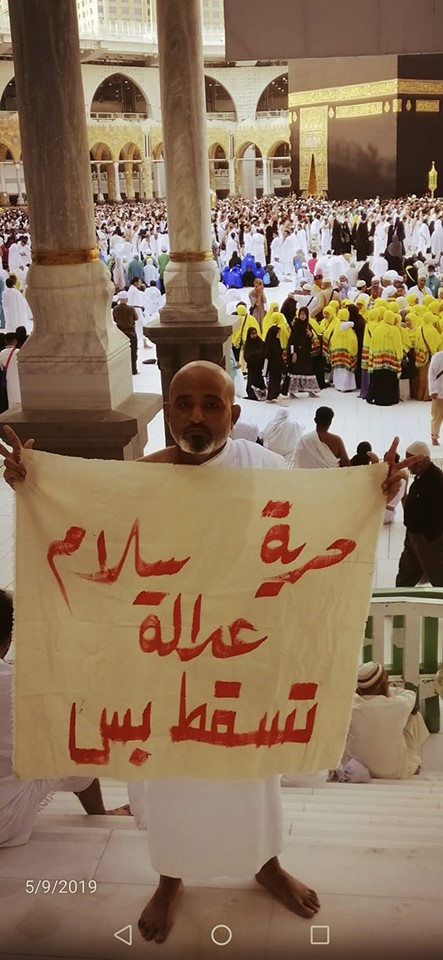 تنافس ناشطون داخل مواقع التواصل الاجتماعي بالسودان على نشر صورة لمعتمر سوداني قام برفع شعار الثورة السودانية (حرية سلام وعدالة..تسقط بس) وذلك من أمام الكعبة الشريفة.