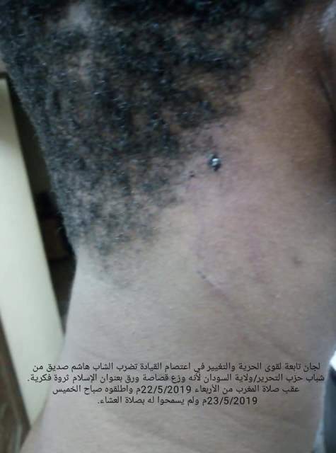 قام الأخ هاشم بالتوزيع للمصلين في نفس الخيمة، ولما توجه اتجاه خيمة أخرى، قال بعضهم للناس (تعالوا شوفوا ديل ناس عبد الحي) فرد عليهم الأخ هاشم لا أتبع لعبد الحي ولا غيره أنا حزب التحرير، والورقة أمامكم فيها توقيع الحزب، فسألوه (أنت بتوزع لينا هل عارفنا نحن مسلمين) فسألتهم طيب أنتو شنو؟ قالوا: (نحن مسيحين ) (فقال لهم اعتذر يا شباب أنا ما عارفكم أنتو غير مسلمين فارجو أن ترجعوا لي ورقي) فسلموني الورق – فأصبح يقول بعضهم الشاب ده خذوه للاستخبارات.. وبعضهم قال تعال يا شاب أنت مشكلتك شنو؟ فعرضت عليهم القصاصة، وقلت لهم أنا حزب التحرير وده قصاصة فيها أفكار من الإسلام رؤية في مسائل الحكم والسياسية والناس ديل اعترضوني) وقالوا للاخرين: ( الشاب ده وزع ورقوا وانتوا ما قبلتوه خلوه يمشي يوزع قدام) ومشيت قدام جاءني ثلاثة شباب يلبسون بطاقات مكتوب عليها الإعلام، وقالوا لي انت بالتوزع المنشور قلت لهم نعم، وقالوا لي تعال معانا، قلت ليهم جدا وأصبحوا يدفعوني بأيديهم فقلت لهم أسمعوا ياشباب أنا ماشي معاكم وما في داعي للدفع بالأيدي فاوقفهم أحدهم، ومشينا لقينا عدد تقريبا سبعة أو تسعة .. كلهم لابسين بطاقات مكتوب عليها الإعلام.. وأدخلوني إلى مبنى وأصبحوا يضربوني في الوجه، وفي أنحاء متفرقة من الجسم، وعندما بدأت أصيح للناس أن ينجدوني فأصبحوا يقول الذين يضربونني للناس (الزول ده كوز) فأصبحت أصيح أنا ما كوز، فتجمع الناس، ولكن لم يتدخل أحد حتى أدخلوني هؤلاء بالقوة وأغلقوا الباب بالطبلة وطلبوا من الناس عدم التجمهر، وقالوا للناس الأمر عادي.. وأدخلوني في غرفة واطفأوا الإنارة حتى تفرق الناس، وبعدها عادوا وتقريباً عددهم قرابة ال20 أضاءوا النور، وقاموا بالإساءة النابية والألفاظ البذيئة والضرب بالخراطيش وأسواط الكهرباء، وضرب في الجبهة الإمامية للوجه، وضرب في الصدر، والضرب بالأيدي في الوجه كثيراً حتى أصابوا عيني اليسرى وقد تغير لونها للأحمر وهي تؤلمني بشدة، (وهاشم يتحدث وهو يضع يده على عينه المحمرة)، وهناك جرح في العنق على يده اليمنى تحت الأذن يسيل من الدم (مرفق صور) وقال قاموا باستجوابي بالضرب والاستهتار والاستفزاز، منذ عقب صلاة المغرب حتى بعد صلاة العشاء والتروايح، ولم يسمحوا لي بالصلاة، وأصبحوا يسيئون الذات الألهية سبحانه وسب للإسلام، ولم يسمحوا لي بالكلام وعندما يسألونني وأريد الإجابة يقولون لي أسكت ويقومون بضربي، وقالوا هل جايبين منشوراتكم دي لينا أنحنا كفار، حزب التحرير نفس فكر داعش.