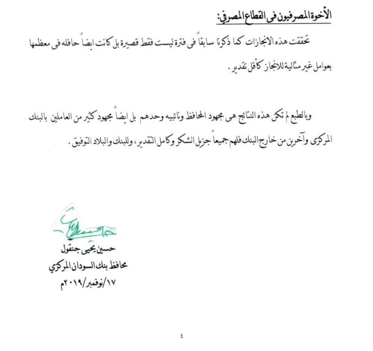 وخط جنقول خطاباً للموظفين بالبنك المركزي في السابع عشر من الشهر الجاري أبان فيه الانجازات التي تحققت بالبنك خلال الفترة الماضية وفي مقدمتها حل مشكلة السيولة.