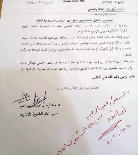 تداول ناشطون على نطاق واسع تفاصيل خطاب معنون إلى وكيل وزارة الطاقة والتعدين يطلب فيه الموافقة على تشغيل طلمبة بنزين داخل سور المؤسسة السودانية للنفط. وقال الخطاب الممهور بتوقيع مدير عام الشؤون الإدارية د. عبد الرحيم عبد الكريم النور أن النقابة يتمثل طلبها في مبادرتها لتذليل مشكلة شح المواد البترولية للعاملين بتوفير طلمبة متحركة لإمداد البنزين لعربات الموظفين والترحيل. وقال الخطاب أنه تم أخذ الموافقة من الجهات المختصة التي حددها بشركة النيل للبترول والإدارة العامة للصحة والسلامة والبيئة والإدارة العامة للإمدادات وتجارة النفط. وجاء رد الوكيل بالموافقة على الطلب، الأمر الذي أثار ردود أفعال واسعة، وقال ناشطون أن المؤسسة سعت لحل جزئي لأزمة موظفيها متجاهلة معاناة قطاع عريض من المواطنين الذين إضطر بعضهم إلى قضاء الليالي أمام محطات الوقود في أجواء باردة إنتظاراً للتزود بحصتهم، وطالبوا بالعدالة الاجتماعية.