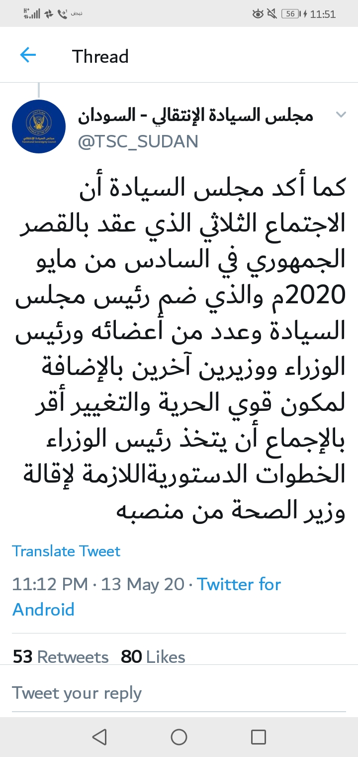 السيادي يعيد نشر تغريدة إقالة وزير الصحة والتي تم حذفها سابقاً اليوم التالي
