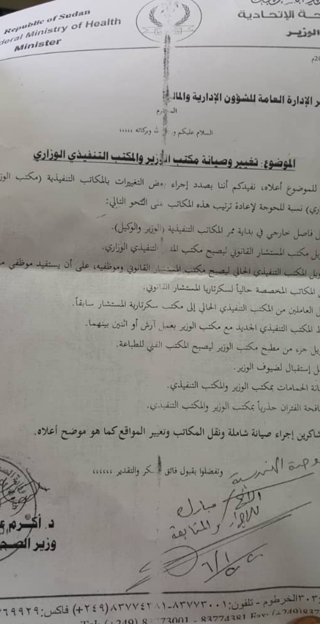 الطلب الوزاري لم يكتفي بذلك بل شمل الخطاب اجراء تغيير وصيانة لمكتب الوزير والمكتب التنفيذي الوزاري التابع له حددها وفصلها بدقة وتشمل عمل فاصل خارجي في بداية ممر المكاتب التنفيذية (الوزير والوكيل).. تحويل مكتب المستشار القانوني ليصبح مكتب المدير التنفيذي الوزاري مع ربط المكتب التنفيذي الجديد مع مكتب الوزير بعمل ارش او اثنين بينهما مع إستقطاع جزء من مطبخ مكتب الوزير ليصبح المكتب الفني للطباعة بالاضافة لعمل استقبال خاص لضيوف الوزير مع صيانة حمامات مكتبه واختتم د. أكرم توجيهاته التسع بالتشديد على ضرورة مكافحة الفئران جذريا بمكتبه والمكتب التنفيذي والقضاء عليها ليتم بعد ذلك تحويل الخطاب للوحدة الهندسية للإجراء والمتابعة.. ومكافحة القوارض.
