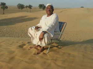 وبدأ “البدوي” في الصورة اللافتة للانظار والتي لم يكشف عن مكانها وتاريخها، وهو بالجلباب السوداني، جالساً على كرسي حافي القدمين، وسط كثبان رملية ساحرة بعيداً عن الضوضاء.