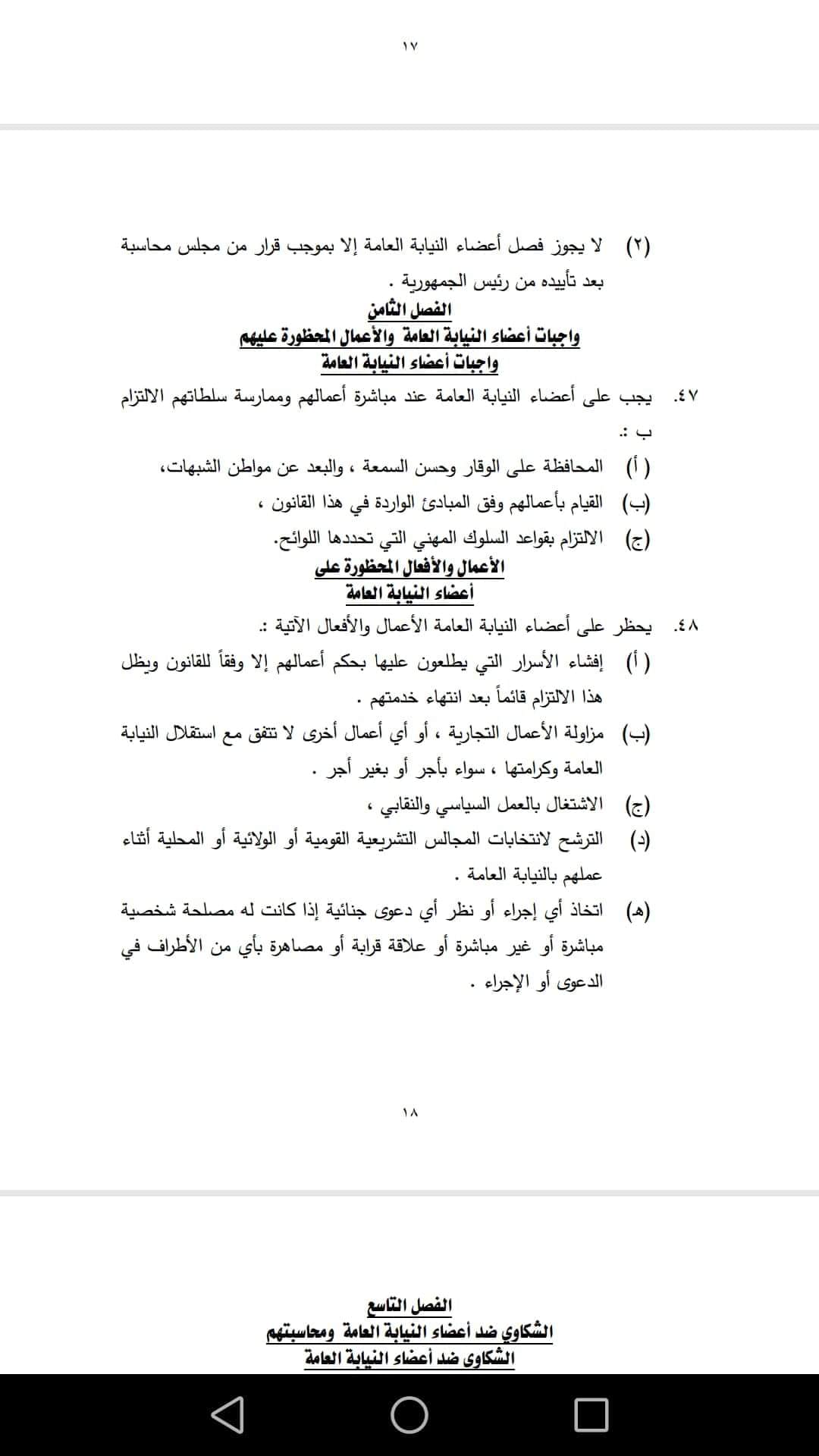 وكانت الفقرة ج من المادة 48 من قانون النيابة العامة تحظر ممارسة العمل النقابي لاعضاء النيابة العامة.