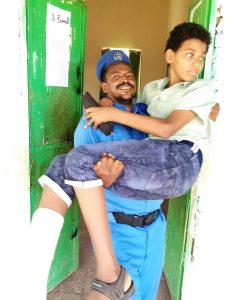 شاهد بالصورة: في لفتة انسانية طيبة ..رجل شرطة سوداني يتطوع بحمل تلميذ مُصاب إلى قاعة الإمتحان