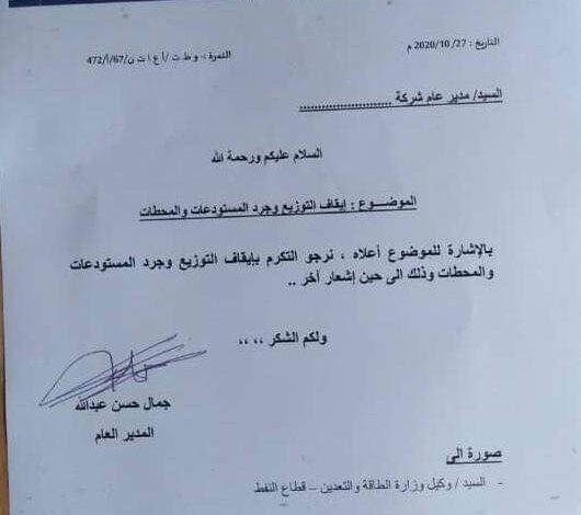 أصدرت الإدارة العامة للإمدادات وتجارة النفط، قراراً بإيقاف التوزيع وجرد المستودعات والمحطات إلى إشعار آخر.