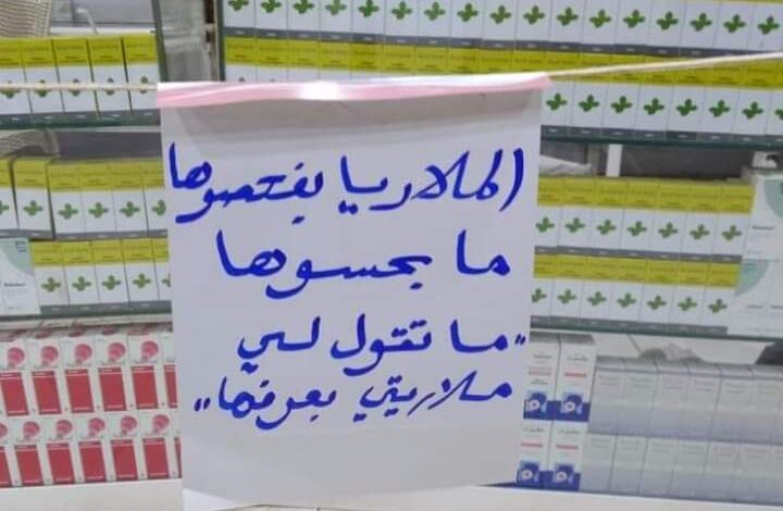 شاهد بالصورة: صاحب إحدى الصيدليات يضع رسالة توعوية للمواطن بمرض الملاريا