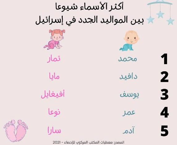 اما اسماء البنات، فيتجلى اسم مايا الأكثر شيوعا في إسرائيل في العام 2020 وتتشارك فيه اليهوديات والمسلمات، اضافة الى اسم مريم المرغوب في الوسطين العربي واليهودي! تعرف على المزيد من هذه الأسماء.