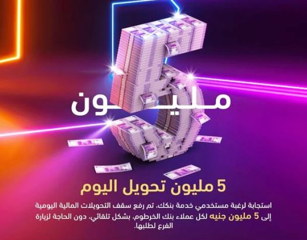 وقال البنك في منشور على صفحته الرسمية بـ(فيسبوك) اليوم “إستجابة لرغبة مستخدمي #خدمة_بنكك، تم رفع سقف التحويلات المالية اليومية إلى 5 مليون جنيه لكل عملاء بنك الخرطوم، بشكل تلقائي! دون الحاجة لزيارة الفرع لطلبها”.