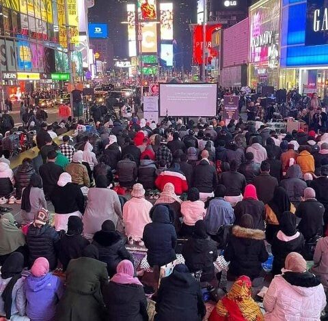 تجمع  الأشخاص في “التايمز سكوير” بولاية نيويورك الأمريكية، يوم السبت (بالتوقيت المحلي) للاحتفال ببداية شهر رمضان، وأقاموا صلاة التراويح.