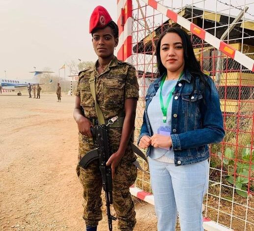 شاهد بالصورة.. بعد فترة من الغياب.. الإعلامية السودانية رفيدة ياسين تظهر بــ(البنطلون) وتحت حماية أمنية مشددة من إحدى حسناوات الجيش