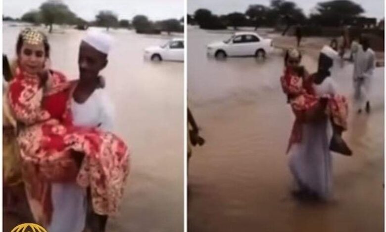 وبحسب رصد ومتابعة محررة موقع النيلين فقد أظهرت الصور المتداولة عريس سوداني يحمل عروسته ليعبر بها السيول الكثيفة التي ظهرت واضحة في الصور.
