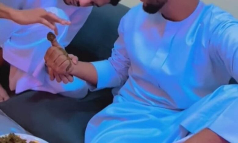 وبحسب رصد ومتابعة محرر موقع النيلين فقد أظهر الفيديو المتداول المغترب الشاب وهو يقوم بوضع “الحناء” على يد صديقه العريس الذي سيغادر البلد التي يعيش فيها متوجهاً إلى السودان لتكملة مراسم زواجه.