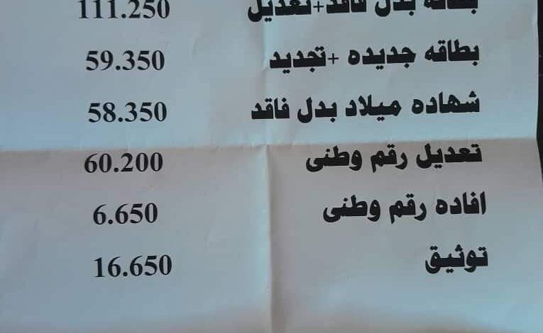 فيما بلغ سعر البطاقة الجديدة + تجديدها 59.350, أما شهادة الميلاد بدل فاقد فقد بلغت تكلفة استخراجها 58.350, وبلغت تكلفة تعديل الرقم الوطني 60.200.
