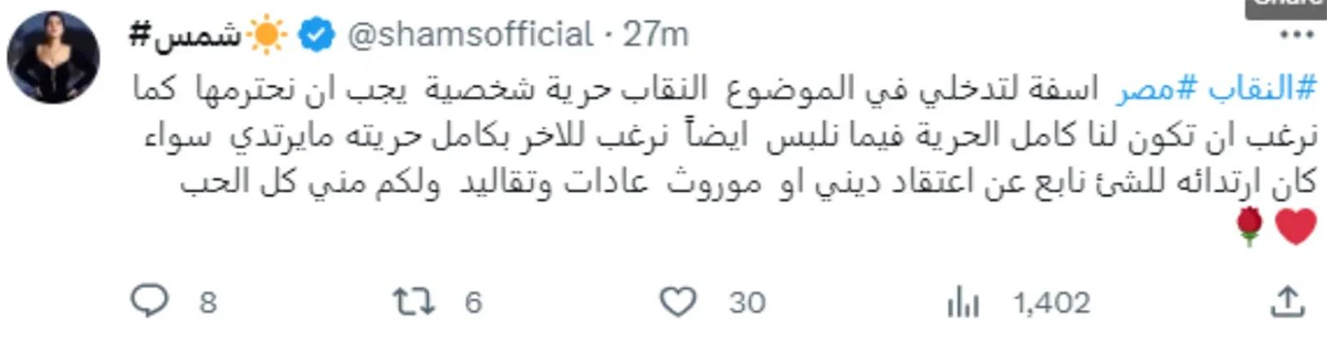 وفي تغريدة على حسابها عبر تطبيق “أكس”، عبرت شمس عن رفضها لهذا القرار بالمطلق، مؤكدة أن كل شخص لديه الحرية في اختيار اللباس الذي يناسبه، اذ قالت: “آسفة لتدخلي في الموضوع، النقاب حرية شخصية يجب أن نحترمها، كما نرغب أن يكون لنا كامل الحرية فيما نلبس أيضاً نرغب للآخر بكامل حريته، يرتدي ما يشاء سواء كان ارتداؤه للشيء نابعًا من اعتقاد ديني أو موروث عادات وتقاليد ولكم مني كل الحب”. وأشارت شمس في ردها على منتقدي منشورها، أن والدتها منقبة واختارت وضع النقاب عن قناعة كاملة.