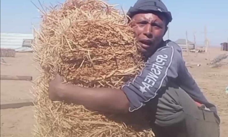حيث قام الرجل باحتضان علف “البهائم” التي يرعاها وتقبيله مع بكاء ونويح بطريقة مضحكة وهو يردد (فاقد حنان أنا).