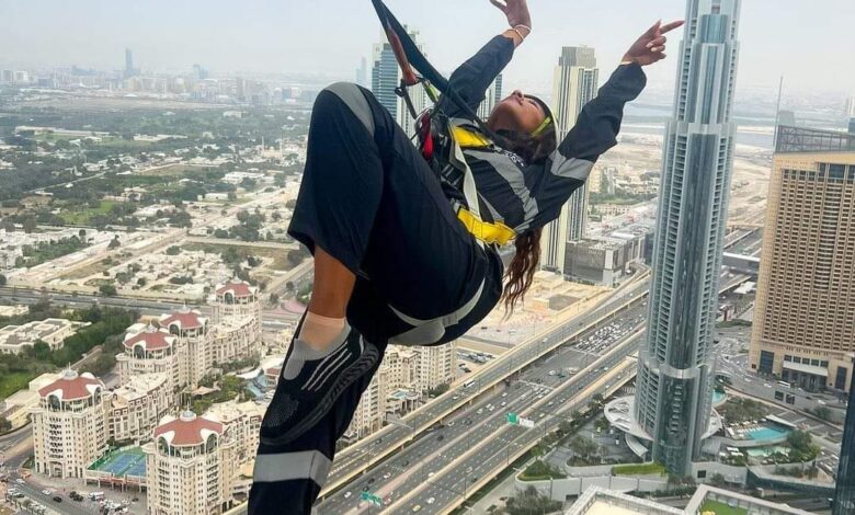 وظهرت تسابيح, وهي تتعلق في الهواء من أعلى المرتفعات بدولة الإمارات العربية المتحدة التي تقيم فيها وسط تعليقات متابعيها الذين عبروا عن دهشتهم من مغامرتها المثيرة.