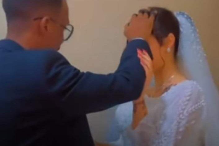 وزاد العريس من اهتمامه ورومانسيته بالعروس بوضع يده على رأسها وهو يقوم بتحصينها بآيات قرانية خوفاً عليها من الحسد والسحر.