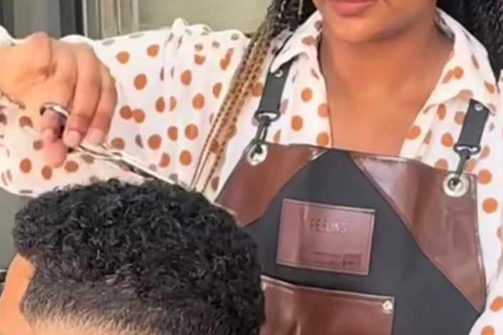 وظهرت الفتاة وهي تقوم بحلاقة شعر أحد الشباب والذي ظهر سعيداً بإبداعها في تصفيف الشعر حسب القصات التي طلبها.