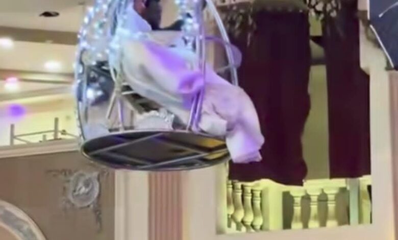 حيث نزل العريس وعروسته من فوق محمولين على “قفص” في شكل “عش” طائر وسط ذهول المعازيم الحاضرين الفرح.