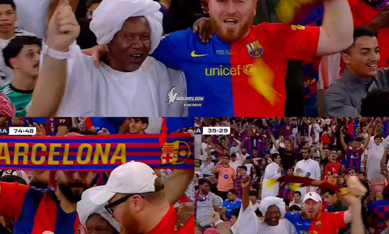 شاهد بالصور.. بالزي القومي.. رجل سوداني يتابع الكلاسيكو من المدرجات ويحتفل مع جماهير برشلونة وساخرون: (بكون ندمان على السنين الحضر فيها مباريات هلال مريخ)