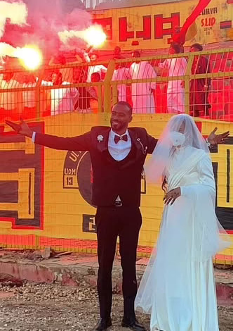 واحتفل “العريس”, المحب للمريخ, مع الجمهور الذي احتفى به وبعروسته التي ظهرت بالزفاف في مشهد يجسد ارتباط “العريس”, بفريقه المفضل.