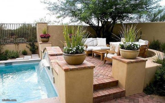 قعده من الالوان الهادئه تطل على حوض السباحه
