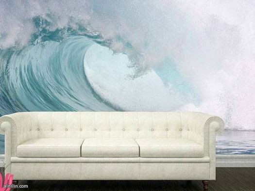 شزلون من اللون الأبيض تعكس معها ورق الحائط على شكل امواج البحر