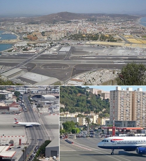مطار جبل طارق – من أغرب ممرات الطائرات لأن المساحة المتاحة لهبوط الطائرات صغيرة جدا اضطر المهندسون لوضع ممر طائرات متقاطع مع طريق عام!!
